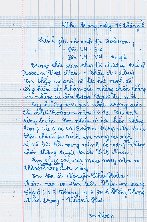 “Nha Trang, ngày 18 tháng 8. Kính gửi các anh đội Robocon. Đội LH – See. Đội LH – VN – Eagle. Trong thời gian theo dõi chương trình Robocon Việt Nam – Châu Á (Abu) em thấy các anh nỗ lực hết mình để cống hiến cho khán giả những chiến thắng và những cú bắn Green Planet đẹp mắt. Tuy không được giải nhất trong cuộc thi Abu Robocon năm 2013. Các anh đừng buồn. Còn nhiều cơ hội chiến thắng trong cuộc thi Robocon trong năm sang. Với chủ đề gia đình, em mong các anh sẽ nỗ lực hết mình để mang về những chiến thắng tuyệt đối cho Việt Nam. Em chúc các anh may mắn và thành công trong cuộc sống. Em tên là Nguyễn Khải Hoàn: Năm nay em tám tuổi. Hiện em đang sống ở B.1.3 Chung cư B Lê Hồng Phong – Nha Trang – Khánh Hòa. Em Hoàn”.