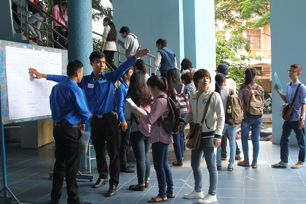 Đội tình nguyện viên chu đáo hướng dẫn phòng thi cho thí sinh