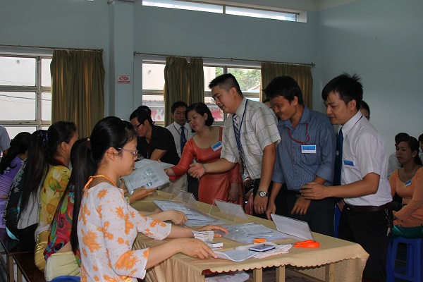 Cán bộ coi thi nhận danh sách phòng thi...
