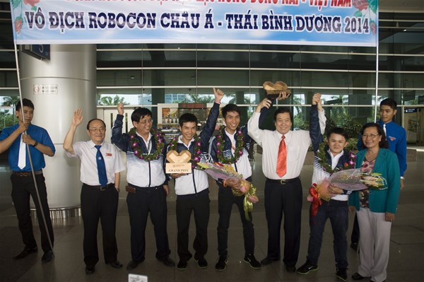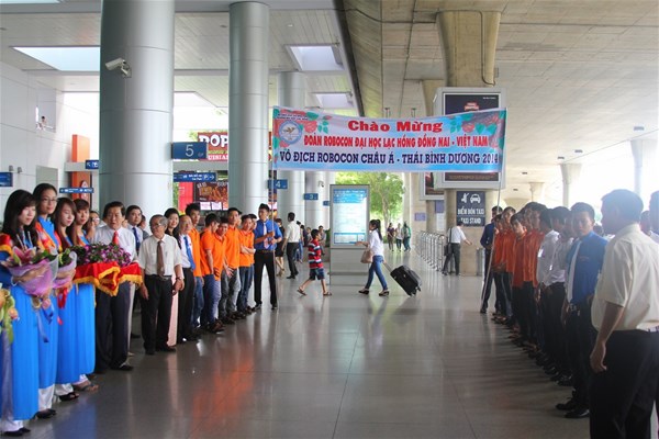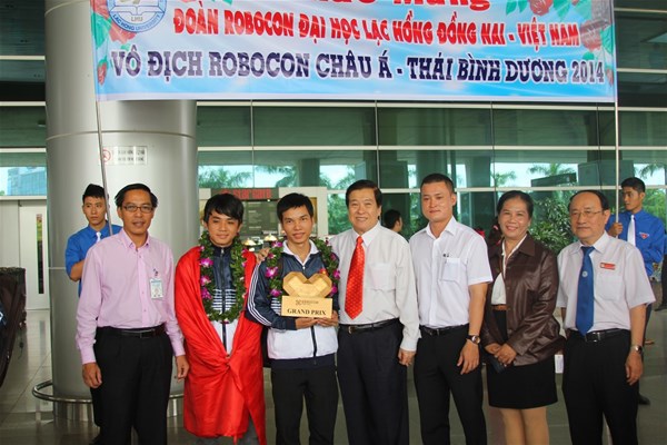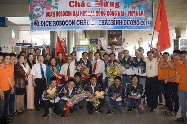 (ĐHLH - 27/08/2014) Sau chiến thắng vinh quang tại đấu trường quốc tế - Sáng tạo Robocon Châu Á Thái Bình Dương 2014 diễn ra ở Pune - Ấn độ, 9:15 đoàn Robocon Lạc Hồng - Đồng Nai - Việt Nam đã về tới Sân bay Tân Sơn Nhất (TP.HCM). Ra đón đoàn tại sân bay, ngoài gia đình, bạn bè của các thành viên đội tuyển, còn có Lãnh đạo các Sở, Ngành của Tỉnh Đồng Nai và Ban Lãnh đạo trường Đại học Lạc Hồng.