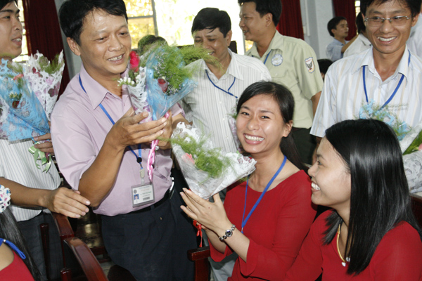 Niềm vui của chị em khi nhận hoa chúc mừng của các đồng nghiệp nam